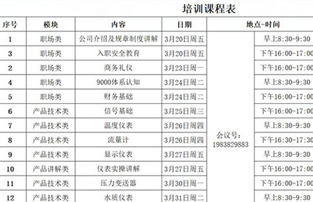 此次培訓(xùn)會(huì)主要圍繞公司規(guī)章制度、入職安全、商務(wù)禮儀等職場(chǎng)類知識(shí)以及水質(zhì)、溫度、壓力等儀表基礎(chǔ)知識(shí)兩方面展開,并邀請(qǐng)了公司里十余位經(jīng)驗(yàn)豐富的資深講師。